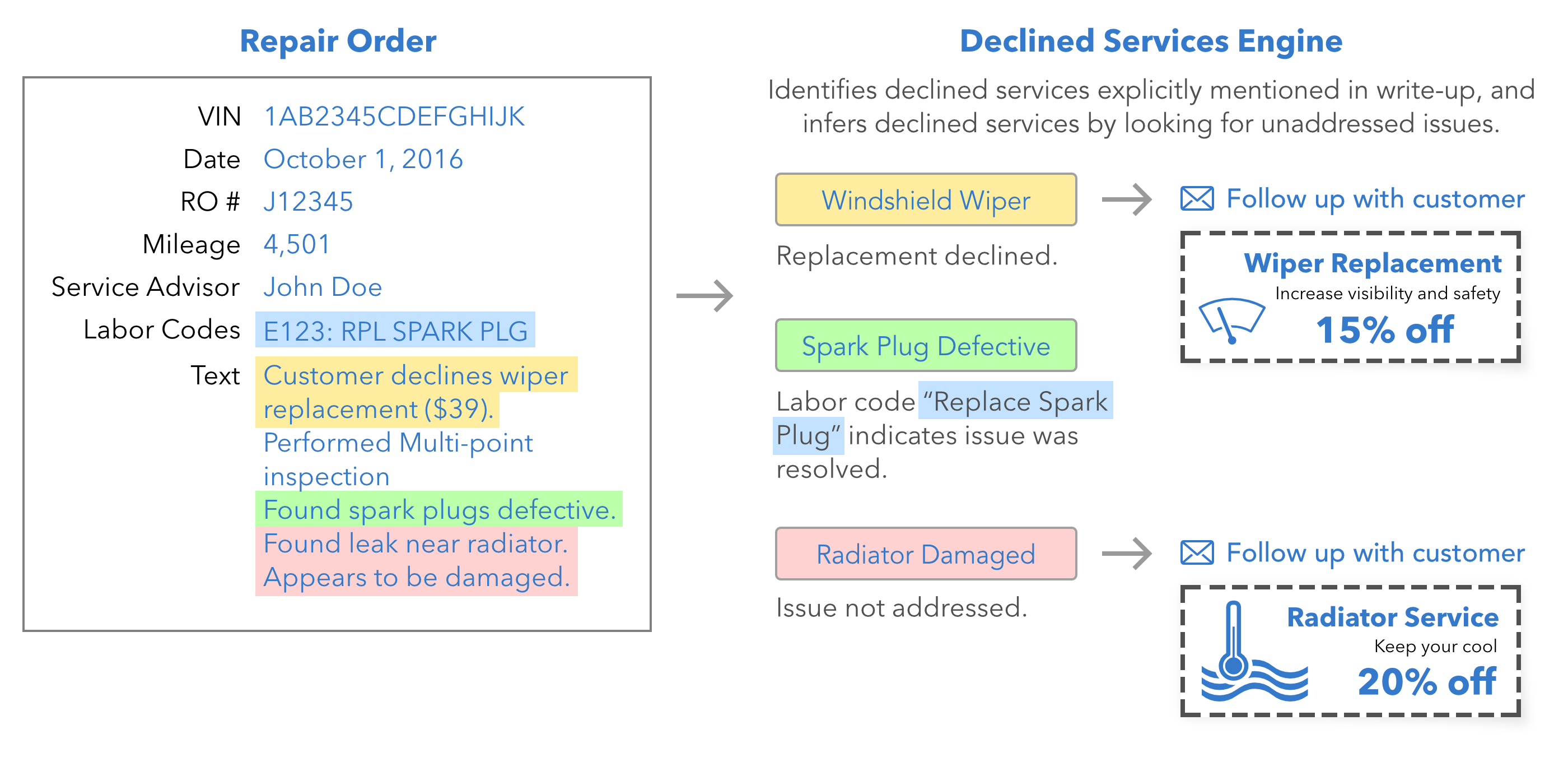 Existing declined service methods rely on imprecise, slow, manual methods to identify opportunities. Our patent-pending technology automatically extracts specific declined services from ROs, and infers additional required services by comparing issues found to the actual work performed.